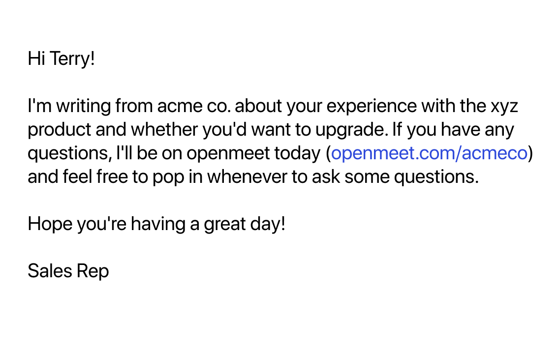 Openmeet allows painless meetings between clients and remote teams without the back and forth of finding a time.