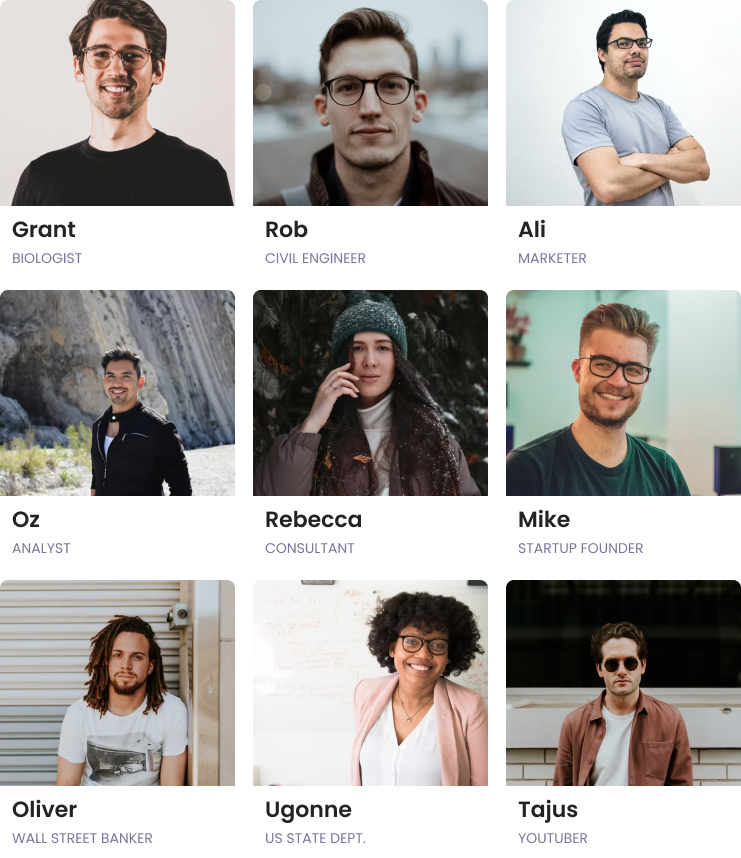 All of our advisors are passionate about helping others figure out what a fulfilling career might look like. While we compensate our mentors, many provide advice at steep paycut to what they would usually charge as they're focused on helping others make the best choices.